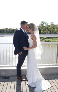 ORIGINAL RETAIL $1800 Timeless crepe gown for a petite nearlywed! Fit and flare silhouette with beaded spaghettis straps and lace and beaded illusion bodice. Classic train and hemmed to 5'9". Taken in slighlt at waist. Preowned and in excellent condition.